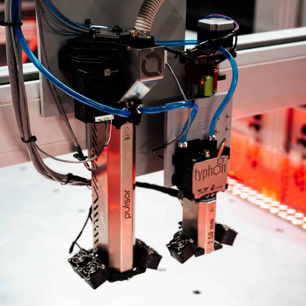 The main difference between them is that Typhoon™ is a filament extruder using a 2.85 mm filament and the Pulsar™ is a pellet-based extruder.